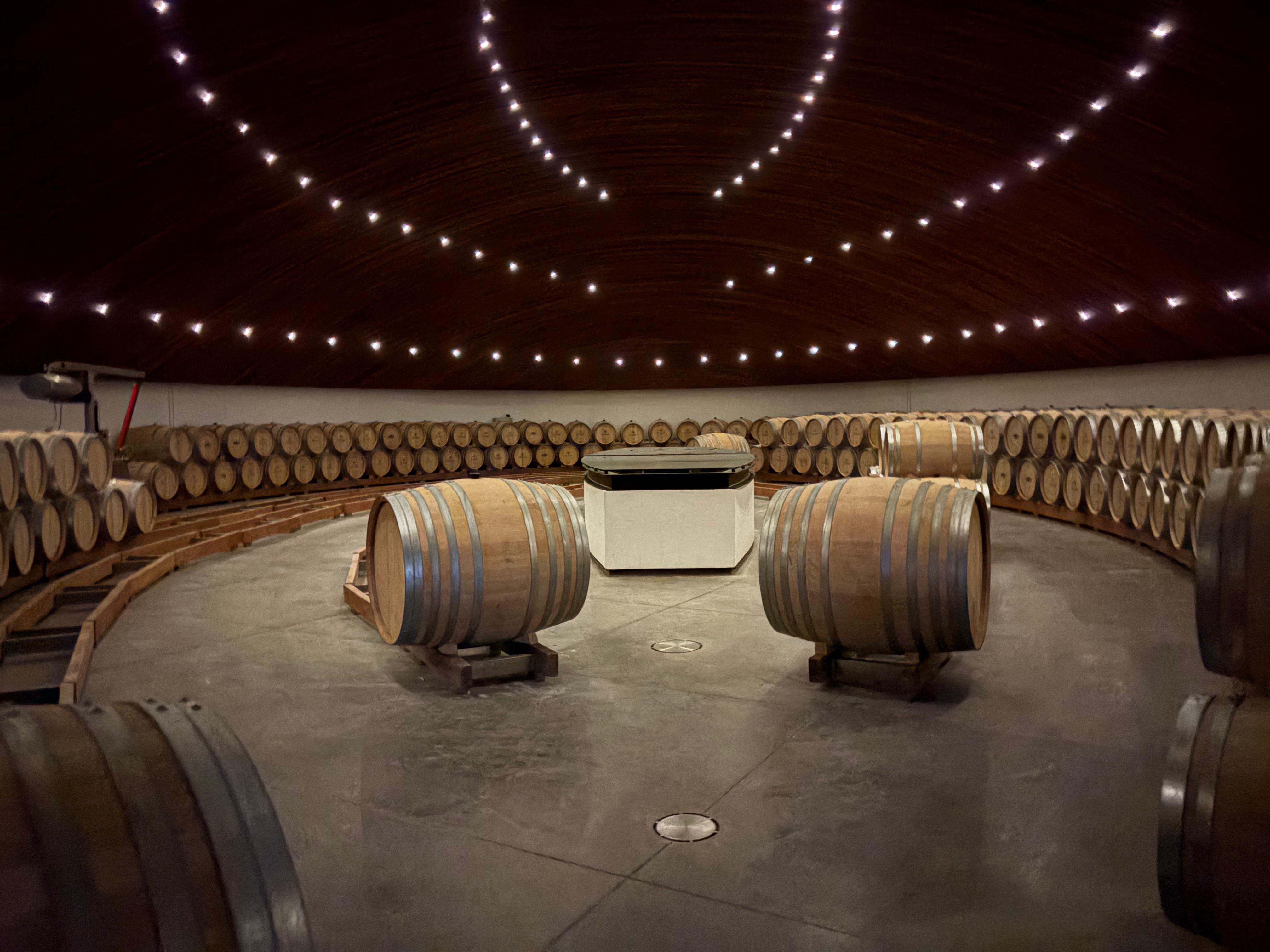 The winery is built into the side of the mountain. You can see the building poking out as you approach. The design resembles the stakes of a wine barrel. Turns out it’s also the roof of a 7-story winery.